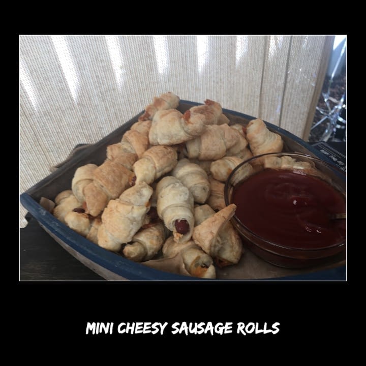 Handmade sausage roll with mini frankfurters and cheese, wrapped in puff pastry. Served with tomato sauce.